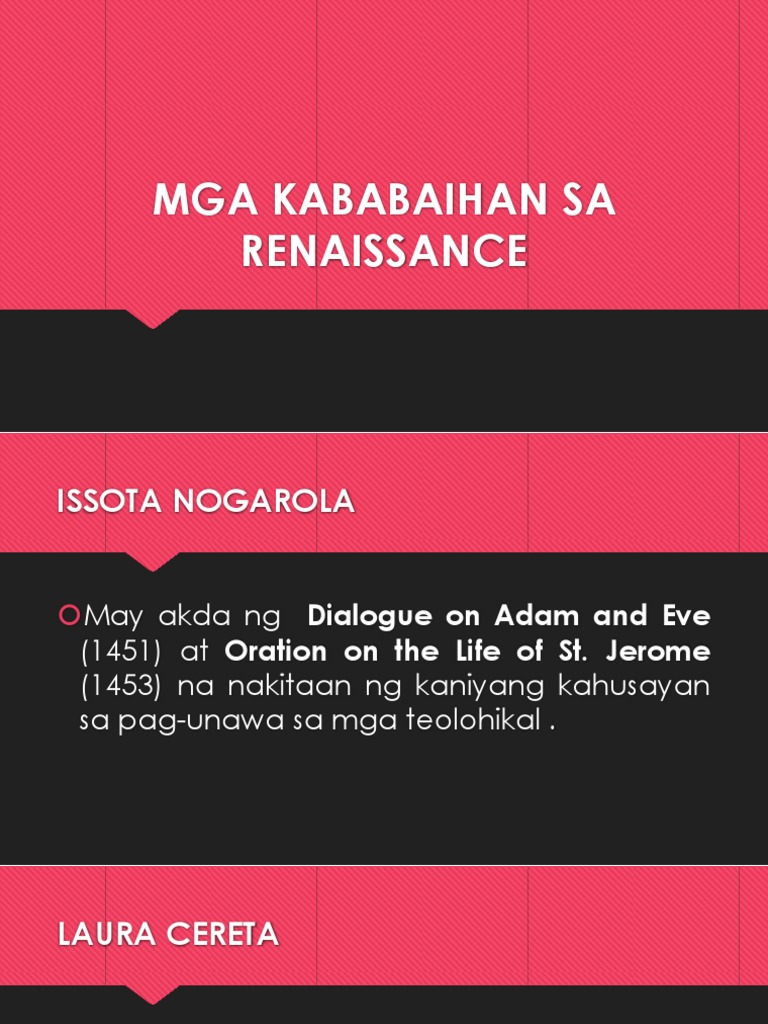 -ang mga akda ng mga manunulat ng Renaissance ang paghamon sa mga kaisipan ng Middle Ages lalo na sa ideya ng pagiging makapangyarihan ng simbahan. Cereta was one of the best scholars in Brescia Verona and Venice in 148892. Laura Cereta September 1469 1499 was one of the great female humanist and feminist writers of fifteenth-century Italy.