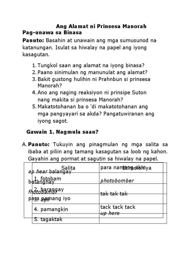 View 1Banghay Aralin_Alamat ni Prinsesa Manorahdocx from FILIPINO 9 at Philippine Normal University. Peralta Isang alamat na pasalin-salin sa ibat-ibang panahon at henerasyon mula noong panahon ng Ayuthaya at. Isinalin sa Filipino ni Dr.