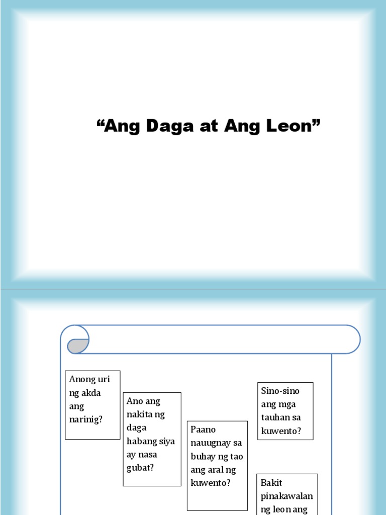 Bigla nitong hinuli ang daga. Isang umaga nagising ang leon dahil may isang maliit na daga na tumakbo sa kanyang katawan. A short summary of this paper.