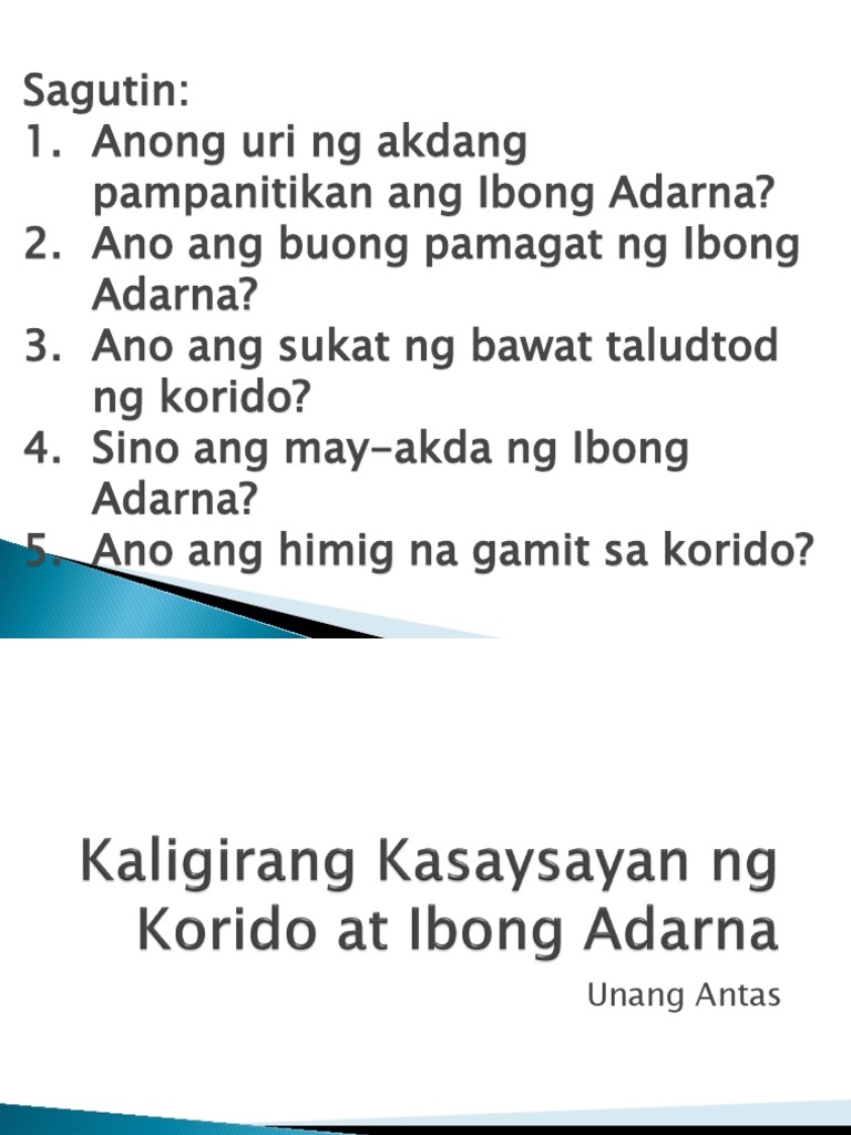 Ibong Adarna Ang korido ay isang uri ng panitikang pilipino isang uri ng tulang nakuha natin sa impluwensya ng mga Espanyol. Bukod sa ibon at kay Don Juan marami pang ibang mga tauhan ang kasama sa koridong Ibong Adarna. Buod ng Ibong Adarna May isang kaharian na ang pangalan ay Berbanya na pinamumunuan ng isang hari na nagngangalang Haring Fernando.