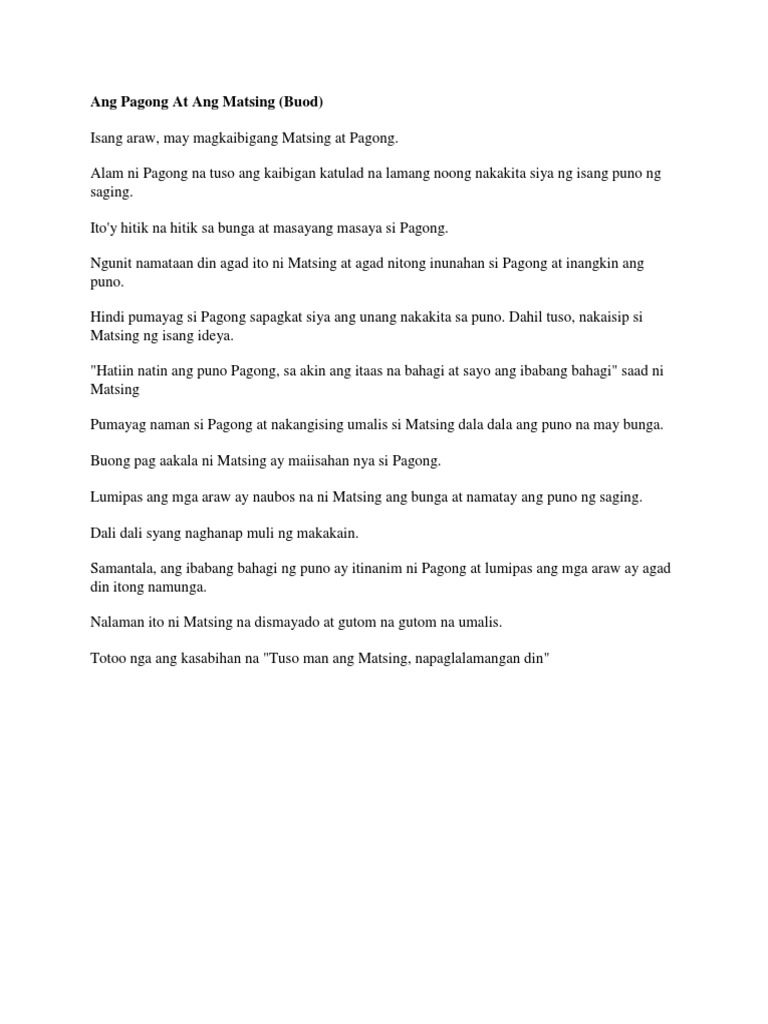 Buod ng si pagong at si matsing. One day the turtle was lying down under the sun when suddenly he saw a banana. Magsisimula ang kwento nila sa paghati ng puno ng saging. When they both find a.
