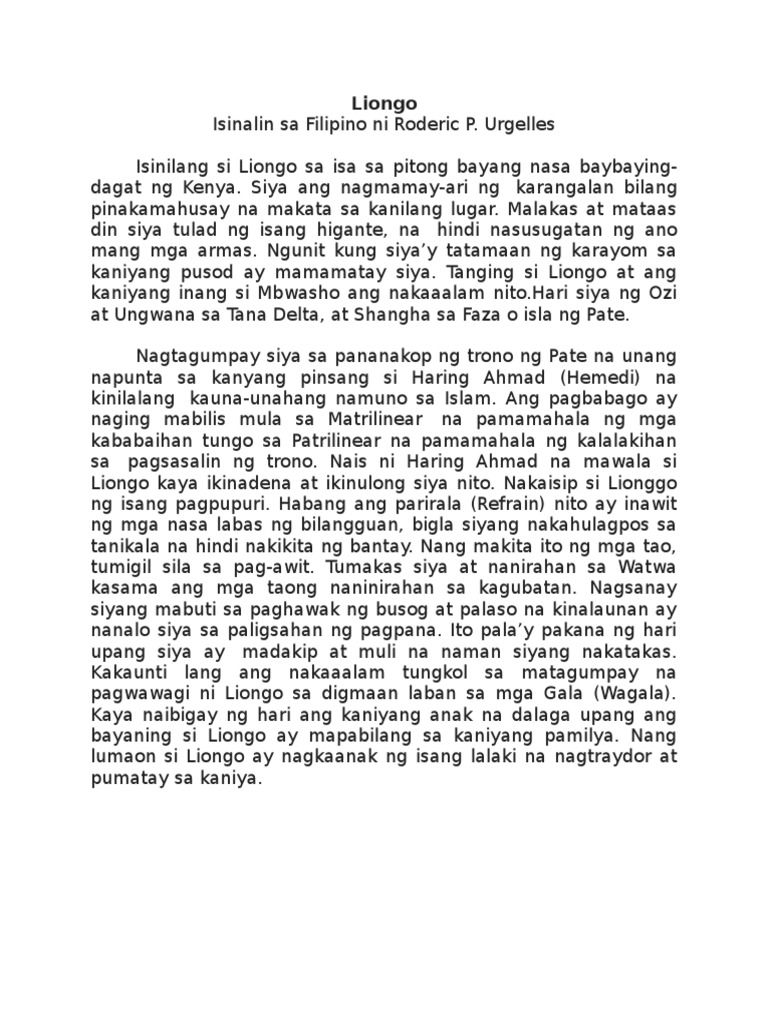 Nang lumaon si Liongo ay nagkaanak ng isang lalaki na nagtraydor at pumatay sa. 3 nasusuri ang mensahe at implikasyong ipinahihiwatig. Ipinakulong ni Sultan Ahmad pinsan ni Liongo si Liongo.