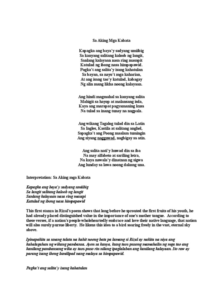 The poem entitled Sa Aking Mga Kabata was written by the Philippines national hero Dr. Sa aking kabata ni Jose Rizal Tula Ang kabanata ko na si Jose rizal tula. Sanlang kalayaan nasa ring masapi.